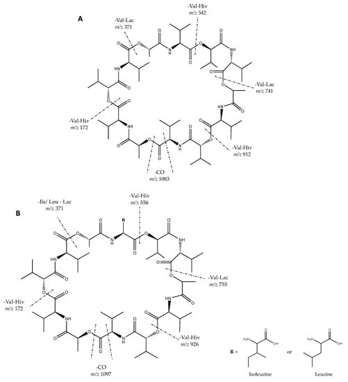Logic MS2 interpretation of putative structure of: (A) valinomycin (m/z 1128.66 [M + NH4]+) and (B) its derivate (m/z 1142.67 [M + NH4]+). The difference between A and B is 14 Da. It might have from the substitution of valine with either isoleucine or leucine. Figure was adapted from [].