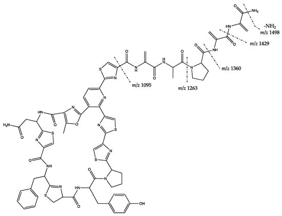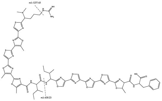 The two putative bioactive precursor ions, 1140.219 [M + H]+ and 1515.373 [M + H]+, were identified from the fraction of Kocuria flava HL 55. The detected precursor ion 1140.219 [M + H]+ is to this point unidentified and has neither been reported by MS1 nor by MS2 (cf. Figure S7). Based on the MS1 and MS2 spectra from the literature, the precursor ion 1515.373 was identified as kocurin []. The MS2 logic of the kocurin fragmentiation showed similar fragments with [], except for the m/z 1095 (Figure 4). All of the mentioned fragments can be seen in the MS2 spectra in Figure S8.