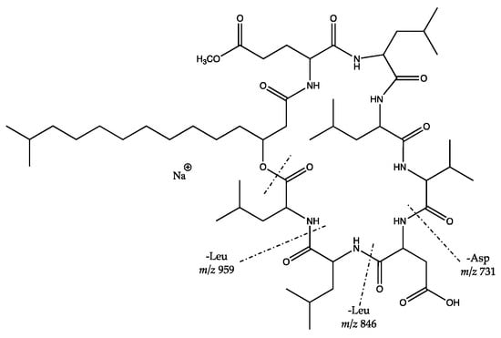MS2 interpretation of putative structure of surfactin (1072.686 [M + Na]+). Figure was adapted from [].