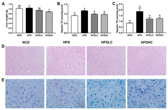 Effects of COS on hepatic steatosis in mice: (A) liver weight; (B) hepatic total cholesterol (TC); (C) hepatic triacylglycerol (TG); (D) hematoxylin and eosin (H&E) staining of liver sections (scale bar, 30 μm); (E) Oil Red O staining of liver sections (scale bar, 9 μm). Data are presented as the mean ± SE (n = 8 per group). Results were statistically analyzed using one-way ANOVA followed by Duncan’s multiple-comparison test, and values with different labels (a–c) are significantly different (p < 0.05). NCD, normal chow diet group; HFD, high-fat diet group; HFDLC, high-fat diet + low dosage of COS (200 mg/kg BW) group; HFDHC, high-fat diet + high dosage of COS (400 mg/kg BW) group; TC, total cholesterol; TG, triacylglycerol.