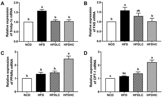 Effects of COS on the mRNA expression of genes related to hepatic lipid metabolism in mice: (A) SREBP-1c; (B) FAS; (C) PPARα; (D) CPT-1. Data are presented as the mean ± SE (n = 6 per group). Results were statistically analyzed using one-way ANOVA followed by Duncan’s multiple-comparison test, and values with different labels (a–c) are significantly different (p < 0.05). NCD, normal chow diet group; HFD, high-fat diet group; HFDLC, high-fat diet + low dosage of COS (200 mg/kg BW) group; HFDHC, high-fat diet + high dosage of COS (400 mg/kg BW) group. SREBP-1c, sterol regulatory element-binding protein-1c; FAS, fatty acid synthase; PPARα, peroxisome proliferator-activated receptor alpha; CPT-1, carnitine palmitoyltransferase 1.