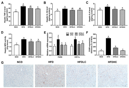 Effects of COS on hepatic inflammation in mice: (A) hepatic TNF-α level; (B) hepatic IL-1β level; (C) hepatic IL-6 level; (D) hepatic MPO activity; (E) relative mRNA expression of F4/80 and CD11c; (F) the IOD/area ratio of F4/80; (G) immunohistochemical staining of F4/80 in the liver (scale bar, 30 μm). Data are presented as the mean ± SE (n = 6 per group). Results were statistically analyzed using one-way ANOVA followed by Duncan’s multiple-comparison test, and values with different labels (a–c) are significantly different (p < 0.05). NCD, normal chow diet group; HFD, high-fat diet group; HFDLC, high-fat diet + low dosage of COS (200 mg/kg BW) group; HFDHC, high-fat diet + high dosage of COS (400 mg/kg BW) group. TNF-α, tumor necrosis factor-α; IL-1β, interleukin-1β; IL-6, interleukin-6; MPO, myeloperoxidase; IOD, integrated optical density.