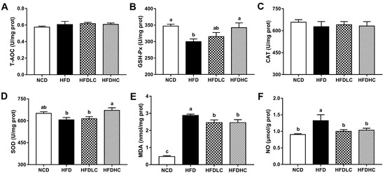 As shown in Figure 4, there were no significantly differences in total antioxidant capacity (T-AOC) and catalase (CAT) activities among all the groups. However, the mice in the HFD group showed significantly lower activities of hepatic glutathione peroxidase (GSH-Px) and higher levels of malonaldehyde (MDA) and nitric oxide (NO) compared to those in the NCD group. Compared with those in the HFD group, hepatic GSH-Px and superoxide dismutase (SOD) activities were significantly increased in the HFDHC group, while MDA and NO levels were significantly decreased in both the HFDLC and HFDHC groups.