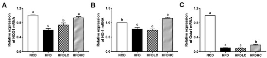Effects of COS on mRNA expression related to hepatic antioxidant capacity in mice: relative mRNA expressions of NQO1 (A), HO-1 (B), and GSTA1 (C) in livers. Data are presented as the mean ± SE (n = 5−6 per group). Results were statistically analyzed using one-way ANOVA followed by Duncan’s multiple-comparison test, and values with different labels (a–c) are significantly different (p < 0.05). NCD, normal chow diet group; HFD, high-fat diet group; HFDLC, high-fat diet + low dosage of COS (200 mg/kg BW) group; HFDHC, high-fat diet + high dosage of COS (400 mg/kg BW) group. NQO1, NADPH quinone oxidoreductase 1; HO-1, heme oxygenase-1; GSTA1, glutathione S-transferase alpha 1.