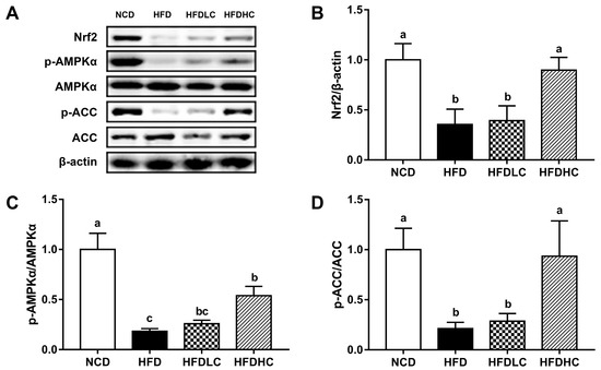 Effect of COS on hepatic protein expression in mice: (A) protein expressions of Nrf2, p-AMPK, AMPK, p-ACC, and ACC analyzed by the Western blot; density identification of Nrf2 (B), AMPK (C), and ACC (D). Data presented as the mean ± SE (n = 4−6 per group). Results were statistically analyzed using one-way ANOVA followed by Duncan’s multiple-comparison test, and values with different labels (a–c) are significantly different (p < 0.05). NCD, normal chow diet group; HFD, high-fat diet group; HFDLC, high-fat diet + low dosage of COS (200 mg/kg BW) group; HFDHC, high-fat diet + high dosage of COS (400 mg/kg BW) group. Nrf2, nuclear factor E2-related factor 2; AMPK, adenosine monophosphate-activated protein kinase; ACC, acetyl-CoA carboxylase.