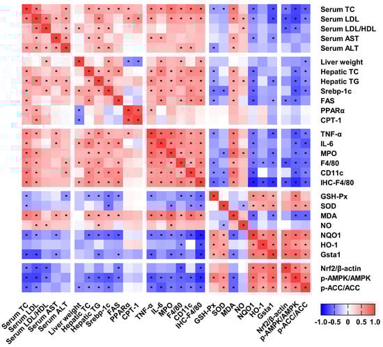 To elucidate the relationship among the serum lipid profile, the hepatic lipid accumulation, inflammation, the oxidative stress, and the related signaling pathway, the Spearman’s correlation coefficients were calculated, as shown in Figure 7. The serum lipid level and the hepatic lipid accumulation were positively correlated with hepatic inflammation and contents of MDA and NO, while they were negatively correlated with the activities and the expressions of antioxidant enzymes. The hepatic inflammation was positively correlated with contents of MDA and NO, while it was negatively correlated with the activities and the expressions of antioxidant enzymes. The AMPK activation was negatively correlated with lipid synthesis and inflammation, while it was positively correlated with antioxidant capacity.