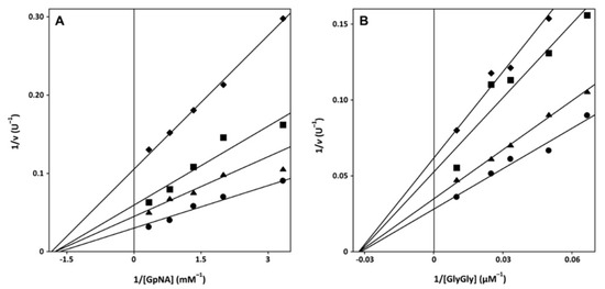 Kinetic analysis of GGT inhibition. EqGGT activity was assayed as reported in Materials and Methods in the presence of 40 mM GlyGly and the indicated concentrations of GpNA (A) or in the presence of 3 mM GpNA and the indicated concentrations of GlyGly (B). Double reciprocal Linweaver–Burk plots were obtained in the absence (closed circle) or in the presence of 5 (closed triangles), 10 (closed squares) or 20 (closed diamonds) µM 5-thio (Panels A, B).
