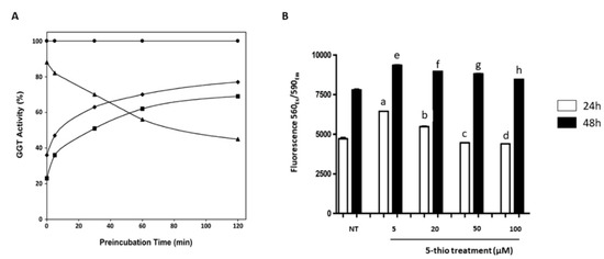 Inhibition of equine gamma-glutamyl transpeptidase (eqGGT) by 5-thiohistidines and cytotoxicity assay of 5-thio on HEK 293 cells. (A) EqGGT was preincubated at 37 °C with 400 µM of DON (closed triangles), 20 µM of 5-thio (closed diamonds), 20 µM of ovo (closed squares), or in the absence of compounds (closed circle) for the indicated times. Immediately following the pre-incubation, the mix was assayed for GGT activity as reported in the Materials and Methods section. Experiments were performed in quadruplicate and data were reported as percentage of enzyme activity in the presence of the inhibitors with respect to the enzyme without the inhibitor. (B) HEK 293 cells were treated for 24 and 48 h with 5-thio at the indicated concentrations, and cell viability was measured by a resazurin-based assay (n = 3). Data were reported as units of fluorescence ± SD. a (p ≤ 0.0001); b (p = 0.0014); c (p = 0.0448); d (p = 0.0218) represent significance compared to NT (not treated) at 24 h; e (p ≤ 0.0001); f (p ≤ 0.0001); g (p = 0.0001); h (p = 0.0045) represent significance compared to NT (not treated) at 48 h.