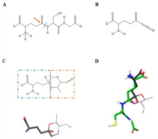 GSH and DON structures and superimposition of their docked poses. (A) 2D structure of GSH, in which the γ-glutamyl bond (blue dashed line) is cleaved following a nucleophile attack (orange arrow) to the δ-carbon of the glutamate moiety. (B) 2D structure of DON. (C) Product of covalent interaction between DON and Thr381 of hGGT both in 2D (on top) and 3D (on bottom) representation. In the 2D structure, dashed lines divide the DON (blue box) from Thr381 (orange box) in the DON–enzyme complex. In the DON 3D structure, carbon atoms are colored grey, oxygen red, nitrogen blue. (D) Superimposition of docked poses of GSH and DON into the glutamyl-binding pocket of hGGT. In the GSH 3D structure, carbon atoms are colored green, oxygen red, nitrogen blue, sulfur yellow, polar hydrogens white. Non polar hydrogens are hidden.