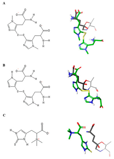 Structures of thiohistidines and superimposition of their docked poses with DON. (A) 2D structure of ovo in disulfide form and 3D structure of ovo in disulfide form superimposed with DON. (B) 2D structure of 5-thio in disulfide form and 3D structure of ovo in disulfide form superimposed with DON. (C) 2D structure of ergothioneine and 3D structure of erg superimposed with DON. In the DON 3D structure, carbon atoms are colored grey, oxygen red, nitrogen blue. In the thiohistidines 3D structures, carbon atoms are colored green, oxygen red, nitrogen blue, sulfur yellow, polar hydrogens white. Non polar hydrogens are hidden.