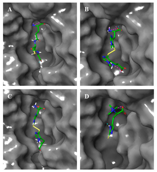 Then, thiohistidine compounds were docked into the active site of hGGT in their most stable forms. Both ovo and 5-thio were docked in their disulfide form and the resulted poses overlapped with the one of DON (Figure 4A,B). Erg was docked in its thione form and the prediction showed that its pose did not overlap with DON (Figure 4C).