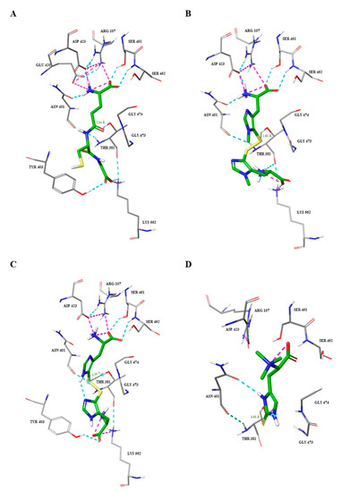The 2D/3D structures of thiohistidines, including ovo, 5-thio and erg, and the ones of the natural substrate of the GGT enzyme, i.e., glutathione, and of the commercial GGT inhibitor, DON, were constructed using PubChem Sketcher V2.4 and SYBYL-X 2.1 software (https://sybyl-x.software.informer.com/2.1/). The crystal structure of human GGT in complex with the GGsTop inhibitor (4ZBK.pdb) was chosen for the study and was derived from the Protein Data Bank (https://www.ebi.ac.uk/pdbe/). Before the docking, water molecules and the inhibitor GGsTop were removed from the protein structure. The hits were docked into the active site of GGT by the use of Glide within Schrödinger-Maestro (Glide; Schrödinger Release 2016—4: Glide, Schrödinger, LLC, New York, NY, USA, 2016) [45,46,47] and the use of three H-bond constraints in the setting conditions (Ser452, Asp423, Asn401). The resulting docking poses were inspected visually and the best scored pose with the typical hydrogen network observed in the crystal structure was chosen.