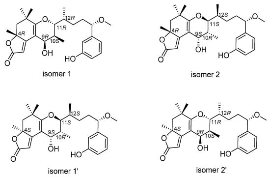 - Tarazona, G.; Benedit, G.; Fernández, R.; Pérez, M.; Rodríguez, J.; Jiménez, C.; Cuevas, C. Can stereoclusters separated by two methylene groups be related by DFT studies? The case of the cytotoxic meroditerpenes halioxepines. J. Nat. Prod. 2018, 81, 343–348. [Google Scholar] [CrossRef] [PubMed]