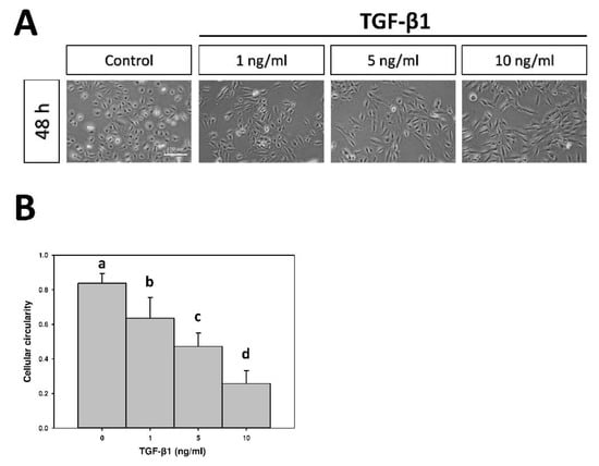 (A) Morphological alteration of A549 cells induced by transforming growth factor-β1 (TGF-β1) at different concentrations for 48 h on tissue culture polystyrene (TCPS). (B) The cellular circularity of A549 cells following TGF-β1 treatment. Data were calculated from four independent experiments (n = 4). Different letters indicate significant differences (p < 0.05). Original magnification: 40×. Scale bar = 100 μm.