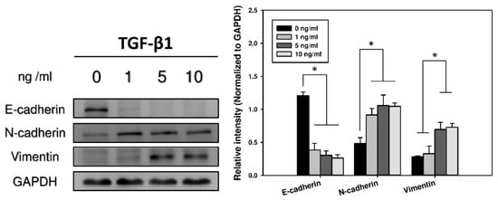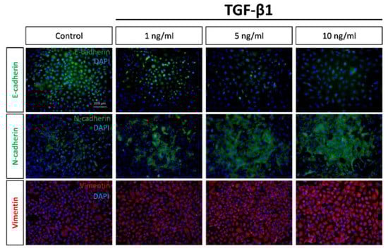 Cadherins, a type of cell transmembrane adhesion glycoproteins that are dependent on calcium ions to function, mediate cell–cell adhesion through their extracellular domains; additionally, they connect to the actin cytoskeleton though its cytosolic tail. Typically, epithelial cells express E-cadherin, whereas mesenchymal cells express N-cadherin []. Furthermore, during the EMT process, the compositional change of cytoskeletal intermediate filaments initiates the expression of vimentin []. Thus, the development of the EMT was assessed by measuring the loss of E-cadherin as well as the acquisition of N-cadherin and vimentin []. Immunofluorescence revealed that the expression of E-cadherin fell as the concentration of TGF-β1 rose among these cells. In contrast, the expression of N-cadherin and vimentin increased as the concentration of TGF-β1 was raised (Figure 2). Western blot analyses further confirmed these results, which were consistent with the EMT phenomenon, in which the epithelial characteristics gradually disappeared and the properties of mesenchymal type emerged with time during the transition (Figure 3).