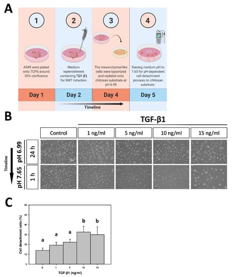 (A) Schematic depiction detailing the time course of cell detachment assay. (B) Morphologies of the TGF-β1-induced A549 cells subjected to the pH-dependent cell detachment process on chitosan. The TGF-β1-induced A549 cells were re-plated on a chitosan substrate at pH 6.99 for 24 h, and then the medium pH was raised to 7.65 for 1 h for cell detachment. (C) The cell detachment ratio of the TGF-β1-induced A549 cells on chitosan. Data were calculated from four independent experiments (n = 4). Different letters (a,b) indicate significant differences, while the same letter indicates no significant differences (p < 0.05). Original magnification: 40×. Scale bar = 100 μm.