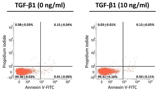 In the cell detachment assay, as illustrated by the time course (Figure 4A), A549 cells and EMT-induced cells were re-plated on chitosan at pH 6.99 for 24 h. Cells were detached from the chitosan substrate and counted after replacement by the pH 7.65 medium for 1 h. At pH 6.99, flattened, polygonal morphologies could be seen in the controls; when the EMT was induced, the polygonal shape became less obvious and exhibited a more rounded shape, as the concentration of TGF-β1 increased (Figure 4B). At pH 7.65, the spherical morphologies were observed in all conditions, indicating the slight attachment or ready-to-detach state of cells. In addition, as the concentration of TGF-β1 increased, the number of remaining adherent cells on chitosan substrate was reduced (Figure 4B). Quantitatively, the CDR was 14.1 ± 2.4% in untreated cells; increased as the concentration of TGF-β1 rose, and reached the plateau ratio of 32.7 ± 5.8% in EMT-induced cells with 10 ng/mL of TGF-β1 (Figure 4C). These results indicate that the cell detachment ability on pH-responsive chitosan rose with the increasing of the TGF-β1 concentration. The concentration of 10 ng/mL was adopted for further experiments. On the other hand, the apoptotic pattern of the detached population from the EMT-induced A549 cells and the untreated controls after cell detachment assay was examined by flow cytometric analyses. Annexin V was used as a probe to detect apoptotic cells by binding to phosphatidylserine upon the cell membrane. Propidium iodide, a small fluorescent molecule, is impermeant to live cells and apoptotic cells, but it stains dead cells [,]. The results revealed no early apoptosis in both A549 cells with and without TGF-β1 treatment (0.50 ± 0.11% and 0.41 ± 0.06%, respectively) (Figure 5). Thus, the cell detachment was due to the pH-dependent deprotonation of chitosan instead of cell death.