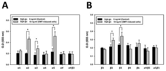 The expression of a subset of integrins in TGF-β1-induced (10 ng/mL) A549 cells, as compared to the untreated control group (0 ng/mL), was analyzed using the α/β-integrin array combo kit. (A) Results of the alpha integrin fluorometric array. Data are expressed as mean ± standard deviation of triplicate samples in each subunit. (B) Results of the beta integrin fluorometric array. Data are expressed as mean ± standard deviation of triplicate samples in each subunit. * p < 0.05 was considered significant.