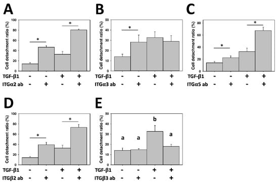The effect of integrin blocking antibodies on the cell detachment ratio of lung cancer on pH-responsive chitosan. Specific neutralizing antibodies were added into the culture medium for blocking integrin-mediated cell detachment in TGF-β1-induced (10 ng/mL) A549 cells, as compared to the untreated control group (0 ng/mL). (A) α2 integrin; (B) α3 integrin; (C) α4 integrin; (D) β2 integrin; and (E) β3 integrin. Data were calculated from four independent experiments for each integrin (n = 4). Significant differences are indicated by asterisk, and different letters (a,b) indicate significant differences, while the same letter indicates no significant differences (p < 0.05).