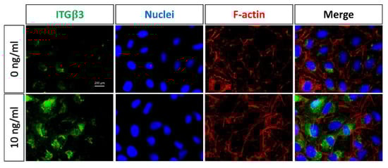 Immunofluorescent staining on TCPS. The expression of the β3 integrin (green) in TGF-β1-induced (10 ng/mL) A549 cells, as compared to the untreated control group (0 ng/mL). F-actin and nuclei were counterstained with phalloidin (red) and DAPI (blue), respectively. Original magnification: 400×. Scale bar = 200 m.
