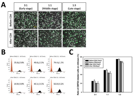 In the experiment of the CDR of the heterogeneous cell mixture, the indicated cells were pre-stained with 10 μM of CellTrackerTM Green CMFDA (Invitrogen, Thermo Fisher Scientific, Waltham, MA, USA) dye in the medium for 30 min at 37 °C, then artificially mixed with indicated cells in proper ratios. The mixed cells were plated onto chitosan substrate for 24 h and followed by the pH-dependent detachment process. The ratio of the CMFDA-labeled cells was counted by flow cytometry (FACSVerseTM; BD Biosciences, Franklin Lakes, NJ, USA) before and after the cell detachment process. The theoretical value of cell ratio remaining on chitosan substrate after the medium pH elevation was calculated by Equation (1):