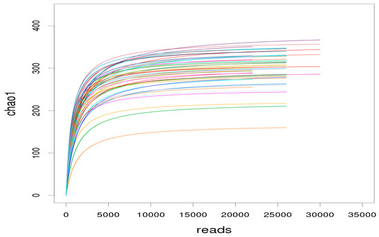 The dilution curve is used to determine whether the sequencing depth is sufficient to cover all microbial species and indirectly reflect the species richness in the samples. When the curve flattens or reaches the plateau stage, it can be concluded that the sequencing depth has covered all species in the samples [16]. As shown in Figure 4, with the sequencing depth increasing, an inflection point appeared around a sequence number of 5000. As the sequencing depth increased further, the curves tended to be flat. When the number of sequences reached 10,000, the curves were in the plateau stage. In this study, the average sequencing depth of each sample was more than 10,000. It was concluded that the sequencing depth was sufficient to cover all bacterial species and enough to reflect the richness level, which also ensured that the data of sample sequencing in each group were reasonable.