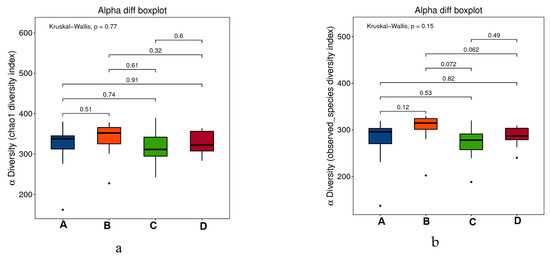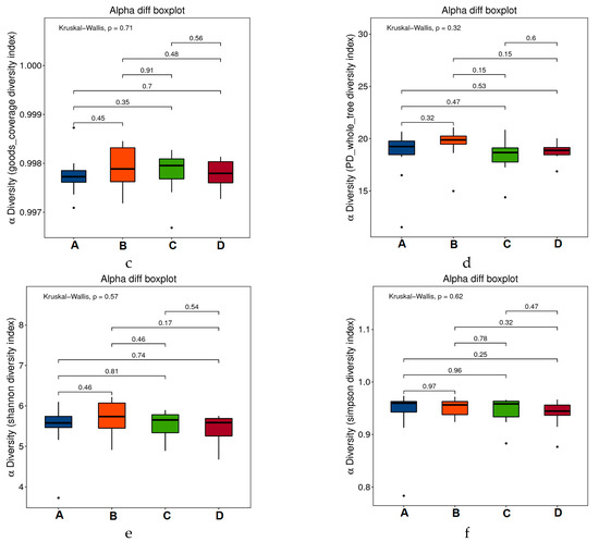 Alpha-diversity boxplots between the four groups, including Chao1 (a), Observed (b), Goods_coverage (c), PD_whole_tree (d), Shannon (e), and Simpson indexes (f).