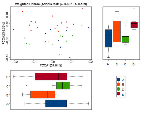 To further compare species diversity differences among samples, principal coordinates analysis (PCoA) was used to assess the differences among samples [18,19,20]. The results of the PCoA analysis of species diversity between samples were shown in the following figure. If two samples are close distance-wise, the species compositions of the two samples are similar. As can be seen from the first principal component in Figure 7, its percentage in the model group (B) was obviously lower than that of the other groups. This indicated the intestinal flora of mice inoculated with tumor cells without any treatment was significantly different from that of the normal control group and the RPE and CP treatment groups. Moreover, the treatment groups (C and D) were close in distance to the normal control group (A), which indicated that their intestinal flora tended to be a certain similarity to the normal group (A). Additionally, in the comparison of the second principal component, the RPE treatment group (C) was also closer to the normal control group (A) than to the model group (B). It demonstrated that the intestinal flora of tumor-bearing mice tended to be more normal after RPE dietary treatment, which is a positive sign for its use in the nutritional intervention of diseases.