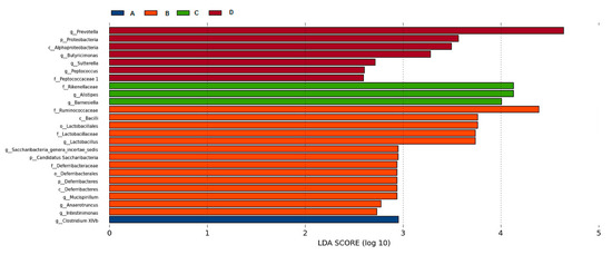 LEfSe (LDA EffectSize) uses linear discriminant analysis (LDA) to estimate the impact of the abundance of each component, and to identify the communities or species that have significant difference effect on the division of samples. It emphasizes statistical significance and biological relevance [17]. According to species richness, the significant difference in intestinal microflora (seen Figure 8) was found in the following genera: Clostridium XlVb (A); Lactobacillus, Saccharibacteria_genera_incertae_sedis, Mucispirillum, Anaerotruncus; Intestinimonas (B); Alistipes, Barnesiella (C); Prevotella, Butyricimonas, Sutterella, Peptococcus (D).