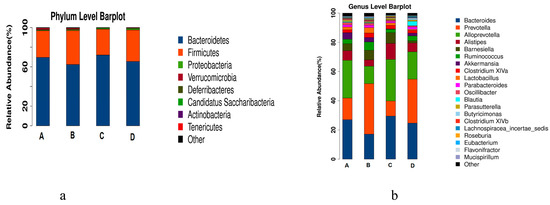 Using the species annotation results, the corresponding histograms of species profiling were generated for each sample at the phylum, class, order, family, and genus classification levels. A histogram of the relative abundance of species can be used to identify species with a higher relative abundance in each group and individual sample at different classification levels [21]. At the phylum level, as shown in Figure 9a, different treatments mainly affected the abundance of Bacteroides and Firmicutes, which accounted for 97% of the total bacteria (shown in Table 1). Compared with that in the normal control group (A), the abundance of Bacteroidetes in the model group (B) decreased and that of Firmicutes increased; the abundance of Bacteroidetes in the RPE treatment groups (C) increased, and that of Firmicutes decreased, which was close to the normal control group (A). Notably, the changing trend of the two phyla of bacteria in the CP control group (D) was similar with the model group (B).