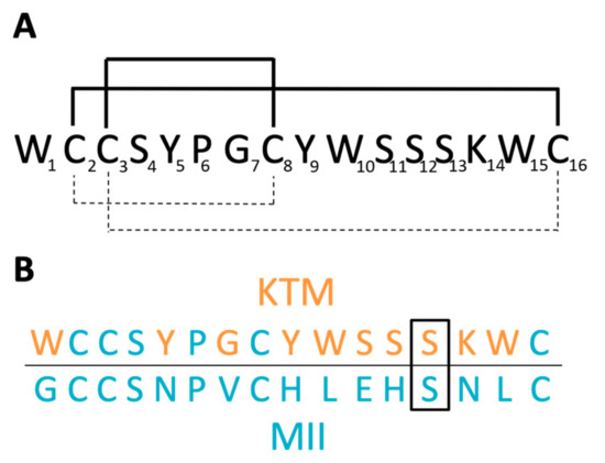 Partial reduction by TCEP of 100 pmol of synthetic KTM peptide gave expected product profiles in LC-MS chromatograms with mass increases corresponding to partial reduction (+2 m/z) and alkylation (NEM, +125 m/z; IAA, +59 m/z) (see Materials and Methods). Sequence analysis showed the disulfide bridging pattern was not consistent with the expected α-CTx C2–C8/C3–C16 globular linkage as found in α-CTx MII, but rather a C2–C16/C3–C8 ribbon linkage (Figure S1), as observed in α-CTx AuIB [36,37].