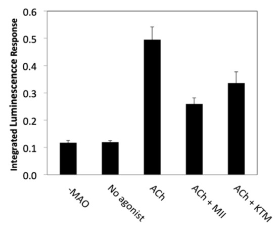KTM was qualitatively evaluated for nAChR bioactivity using a PC12 cell assay; antagonist activity by KTM in the presence of acetylcholine (ACh) was confirmed (Figure 2), prompting quantitative evaluation of bioactivity by electrophysiology. In the preliminary screening qualitative assay, ACh is used to stimulate PC12 cells, opening nAChR channels, resulting in dopamine release [38,39]. Following release, dopamine is oxidized by monoamine oxidase, generating hydrogen peroxide that catalyzes a chemiluminescence reaction involving luminol and horseradish peroxidase, producing a detectable response. Incubation with α-CTxs prior to stimulation with ACh inhibits nAChRs, resulting in a diminished signal, as is observed for treatment with α-CTx MII (see Figure 2). A decreased signal resulting from treatment with KTM indicates that nAChRs are inhibited by this compound.