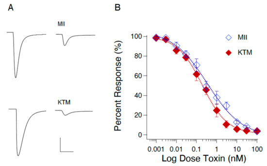 Two-electrode voltage clamp experiments were used to determine the IC50 for KTM on rα3β2 nAChRs expressed in Xenopus laevis oocytes. Figure 3A shows responses to local application of ACh prior to (left) and following (right) toxin exposure. The concentration-dependent curves for inhibition of rα3β2 nAChR by MII and KTM are shown in Figure 3B. KTM exhibited potent inhibition with an IC50 of 0.19 ± 0.02 nM commensurate with α-CTx MII with an IC50 of 0.35 ± 0.08 nM. α-CTx MII and KTM have Hill coefficients of 0.5 and 0.7, respectively.