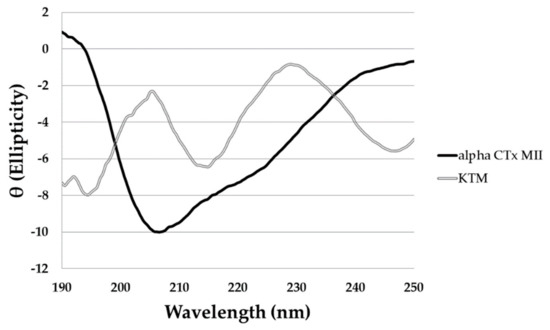 The circular dichroism (CD) spectrum of α-CTx MII (solid black line) and KTM (double lined grey). Measurements for each peptide were taken in water at 50 µM, and a pathlength of 1 mm. The α-helical content of α-CTx MII and KTM were estimated to be 38.1% and 12.5%, respectively, as calculated from the observed signal at 222 nm.