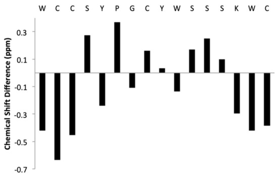 Chemical shift difference between α-protons of amino acids in KTM and predicted random coil chemical shifts for the same amino acids.