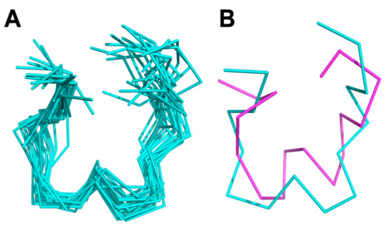 NMR solution structure of KTM, where (A) is a ribbon representation of an ensemble of the 20 lowest energy structures, with an average RMSD to the mean structure of 1.7 ± 0.4 Å, and (B) represents an overlay of the mean calculated structure from NMR (cyan) and the computationally predicted structure (magenta) that have an average RMSD of 3.5 Å.
