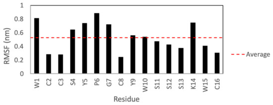 Figure 7 shows the root-mean-square fluctuations (RMSFs) for each residue after a 50 ns molecular dynamics simulation in Gromacs. According to these results, the side chains of KTM are expected to have a high degree of fluctuation. Residues W1, S4–G7, and K14, particularly, show the highest degrees of fluctuation.