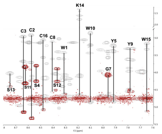 Fingerprint region of COSY (red) and TOCSY (grey) spectra overlaid for residues 1–5 and 7–16, acquired at 600 MHz for KTM at 298 K in 30% ACN/70% H2O. Residue assignments are indicated by their one-letter amino acid code.