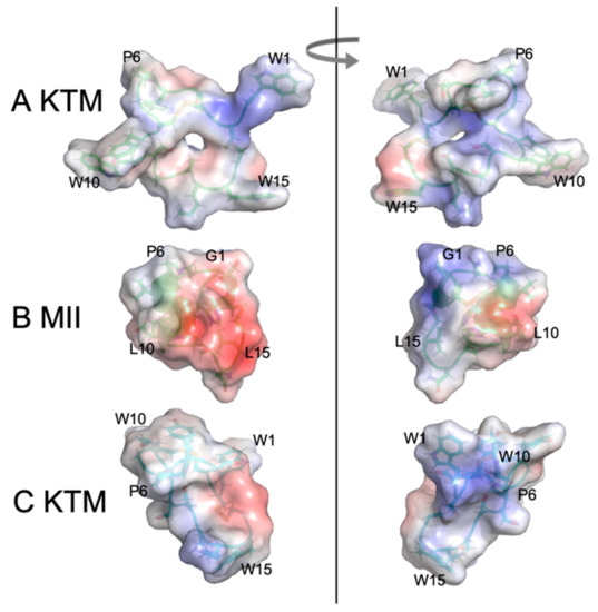 Electrostatic maps of KTM at 0 ns of the molecular dynamics simulation (A), α-CTx MII (B), and KTM at 50 ns of the molecular dynamics simulation (C). Images on the left and right are rotated by 180 degrees.