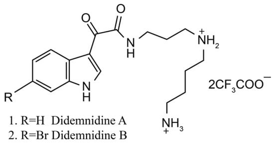 Didemnidines A (1) and B (2) (Figure 2) are two indole spermidine alkaloids isolated from the New Zealand ascidian Didemnum sp. [33]. Both are active as inhibitors of phospholipase A2 and the farnesyltransferase enzyme without cytotoxicity. Didemnidine B also shows mild activity on the malaria parasite. Meanwhile, the two synthetic intermediates of didemnidines display moderate cytotoxicity toward L6 cells and inhibit the proliferation of parasites. The antiparasitic activity of didemnidine B provides the opportunity to explore the didemnidines family as antimalarial and antitrypanosomal agents [34].