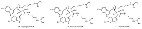 Eusynstyelamides A–C (10–12) (Figure 6) are alkaloids previously isolated from the ascidian Eusynstye lalatericus. However, the structurally similar eusynstyelamide B and ent-eusynstyelamide B, a secondary metabolite from a bryozoan species, suggests the compounds might be synthesized by symbiotic microbes. Eusynstyelamides A–C show specific cytotoxicity against neuronal nitric oxide synthase (nNOS) and show modest anticancer and antibacterial activities [43]. Eusynstyelamides A and B display inhibitory activities against Staphylococcus aureus and the plant regulatory enzyme pyruvate phosphate dikinase (PPDK) [43,44]. In addition, eusynstyelamide B exhibits anti-proliferation activity in MDA-MB-231 cells. It causes a strong cell cycle block at G2/M phases and induces cell apoptosis. Nitric oxide synthase family genes are regarded as its potential target [43,45]. The bioactivities of eusynstyelamides suggest their potential for further medical studies.