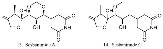 Sesbanimide A (13) was isolated from the bacteria Agrobacterium, which is associated with the ascidian E. turbinata, while sesbanimide C (14) was isolated from the bacteria Agrobacterium, which is associated with the ascidian Polycitonidae sp. (Figure 7) [46,47]. Sesbanimide A showed cytotoxicity against the growth of mouse leukemia cells and inhibited the proliferation of mouth epidermal carcinoma (KB) cell. However, the activity was approximately one-tenth that observed for sesbanimide C [47].