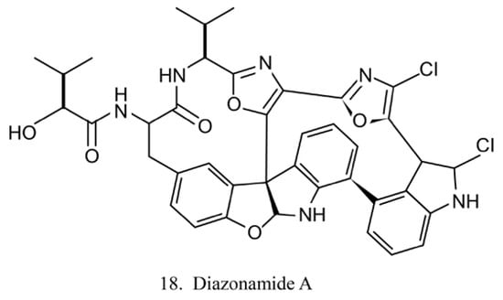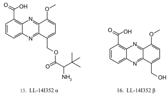LL-14I352 α (15) and β (16) (Figure 8) were isolated from LL-14I352, a bacterium associated with an unidentified ascidian from the Pacific Ocean. LL-14I352 α exhibits strong activity against gram-positive bacteria, but it shows weaker anti-gram-negative bacterial activity, while LL-14I352 β is less active on gram-positive bacteria than LL-14I352 α. Both compounds have been found to inhibit the growth of human ovarian and colon cancer cells. They also exhibit the activities of inhibiting DNA, RNA, and protein synthesis [48].