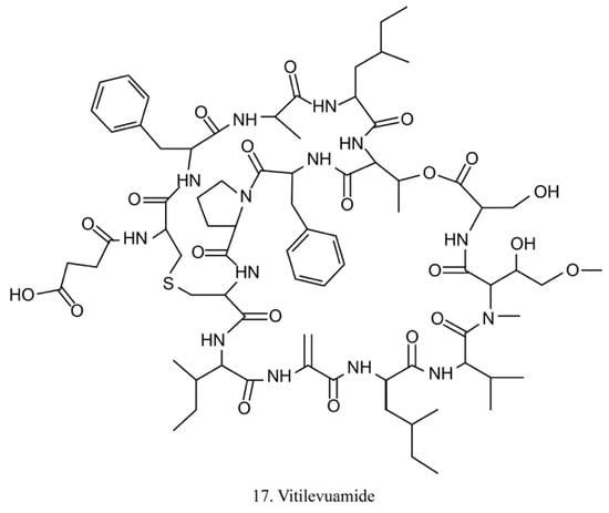 Vitilevuamide (17) (Figure 9) is a bicyclic peptide isolated from the ascidians Didemnum cuculiferum and Polysyncranton lithostrotum. With a functionally correlated totaxol analog, vitilevuamide was shown to be active against P388 mouse lymphocytic leukemia in vivo [53]. The cytotoxic mechanism is due to its inhibition of tubulin polymerization without competitive inhibition of the vinblastine binding site, and it weakly affects GTP binding to tubulin as well as causes cell cycle arrest cells in the G2/M phases [53].