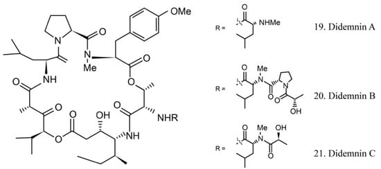 Didemnins A–C (19–21) (Figure 11) were initially identified from ascidian symbiotic microbes. Among them, didemnin B (20), with a high cytotoxicity activity, was the first marine natural product to be utilized in clinical trials [64].