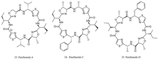The patellamides are cyclic peptides isolated from the cyanobacterium Lissoclinum patella, with host animals belonging to the ascidian Didemnidae family [70]. Patellamides A, C, and D (22–24) (Figure 12) exhibit cytotoxic effects. Patellamides A (22) and C (23) inhibit the growth of L1210 murine leukemia cells, while patellamide D (24) acts as a resistance-modifying agent in the multidrug-resistant human leukemic cell lines, indicating its potential as a drug-resistance modulator [71].