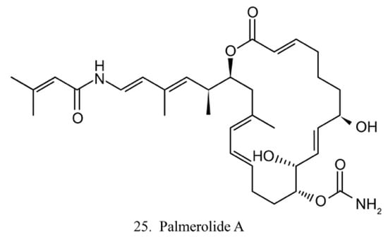 Palmerolide A (25) (Figure 13) is a macrocyclic polyketide isolated from the ascidian Synoicum adareanum. Palmerolide A displays selective cytotoxicity toward melanoma by inhibiting V-ATPase [74]. As a promising compound, palmerolide A was chemically synthesized by enantio-selective methods [75], by which a large amount of palmerolide A and its analogs could be made for the investigation of biological function and application.
