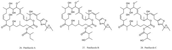 Patellazoles A–C (26–28) (Figure 14) are a family of compounds produced by the α-proteobacterium Candidatus Endolissoclinum faulkneri, a microbe associated with the ascidian L. patella. These compounds display cytotoxicity towards HCT 116 cells by inhibiting protein synthesis, arresting cell cycle at G1/S phases, and inducing cell apoptosis [78]. It is known that their inhibition effects on protein synthesis are achieved by interfering with the mTOR/p70 pathway [78].