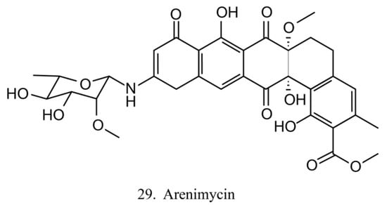 Arenimycin (29) (Figure 15) was isolated from the ascidian E. turbinate-derived bacteria Salinispora arenicola. Arenimycin inhibits the division of HCT cells as well as exhibits potent antimicrobial activities against the drug-resistant strains Staphylococci and Mycobacterium [79]. The antiproliferation and antibacterial activities make arenimycin a potential candidate for clinical medicine [80].