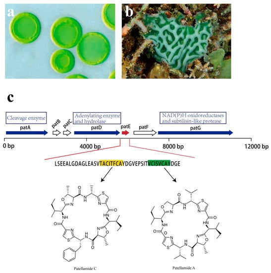 - Schmidt, E.W.; Nelson, J.T.; Rasko, D.A.; Sudek, S.; Eisen, J.A.; Haygood, M.G.; Ravel, J. Patellamide A and C biosynthesis by a microcin-like pathway in Prochloron didemni, the cyanobacterial symbiont of Lissoclinum patella. Proc. Natl. Acad. Sci. USA 2005, 102, 7315–7320. [Google Scholar] [CrossRef] [PubMed]